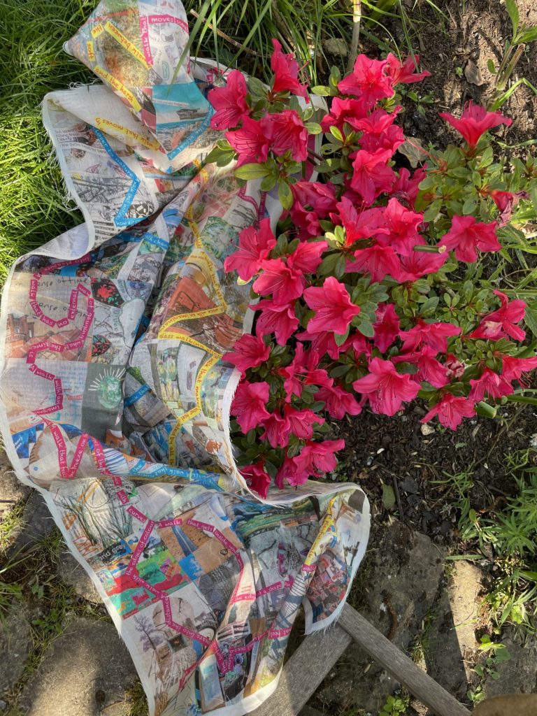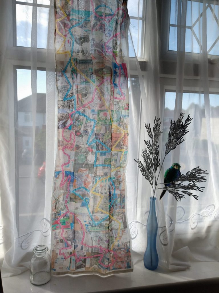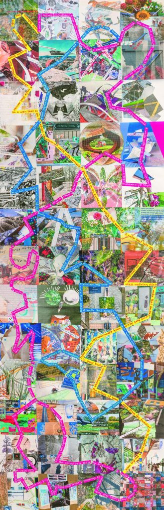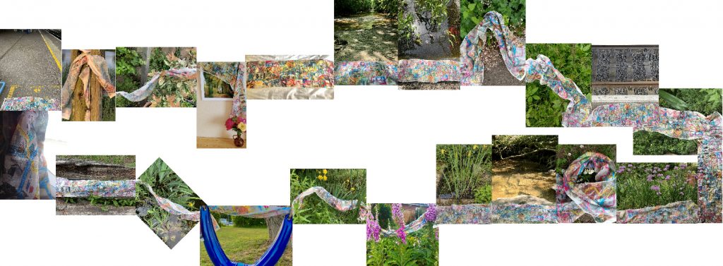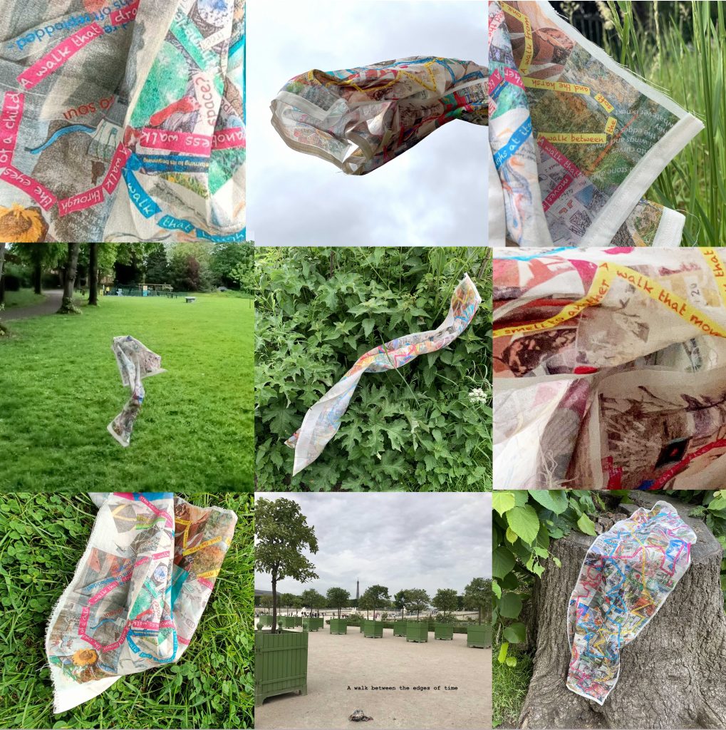 Walks with[out] edges generated 52 collages that fused together experiences of walks in different places across the world. The collages were collaged together and printed onto fabric so that we might carry the collaged walks with us on our walks. For 4 weeks we explored ways of taking the walks for a walk in our own locations.